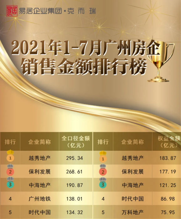 8月6日,克而瑞独家发布《2021年1-7月广州房企销售榜》,恒峰g22国际地产以亮眼业绩表现再次斩获权益金额榜、全口径金额榜双料第一。